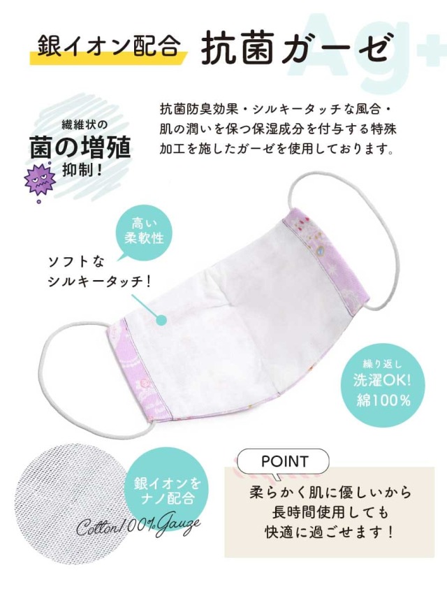 ロマンティックなバレエ柄がカワイイ綿100%布マスク。抗菌効果のある銀イオンを配合したガーゼを使用。柔らかくソフトでシルキータッチな柔軟性が特徴の「アミノンAg+」加工で長時間使用しても快適です!