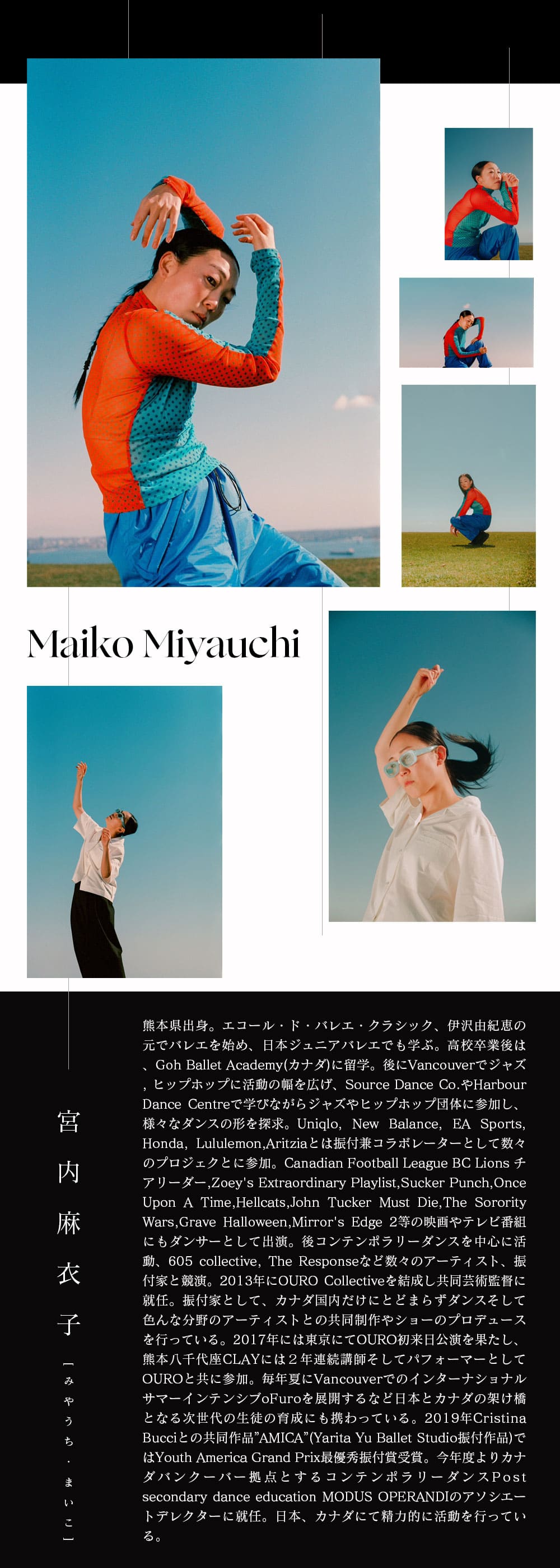 熊本県出身。エコール・ド・バレエ・クラシック、伊沢由紀恵の元でバレエを始め、日本ジュニアバレエでも学ぶ。高校卒業後は、Goh Ballet Academy(カナダ)に留学。後にVancouverでジャズ, ヒップホップに活動の幅を広げ、Source Dance Co.やHarbour Dance Centreで学びながらジャズやヒップホップ団体に参加し、様々なダンスの形を探求。Uniqlo, New Balance, EA Sports, Honda, Lululemon,Aritziaとは振付兼コラボレーターとして数々のプロジェクトに参加。Canadian Football League BC Lions チアリーダー,Zoey's Extraordinary Playlist,Sucker Punch,Once Upon A Time,Hellcats,John Tucker Must Die,The Sorority Wars,Grave Halloween,Mirror's Edge 2等の映画やテレビ番組にもダンサーとして出演。後コンテンポラリーダンスを中心に活動、605 collective, The Responseなど数々のアーティスト、振付家と競演。2013年にOURO Collectiveを結成し共同芸術監督に就任。振付家として、カナダ国内だけにとどまらずダンスそして色んな分野のアーティストとの共同制作やショーのプロデュースを行っている。2017年には東京にてOURO初来日公演を果たし、熊本八千代座CLAYには2年連続講師そしてパフォーマーとしてOUROと共に参加。毎年夏にVancouverでのインターナショナルサマーインテンシブoFuroを展開するなど日本とカナダの架け橋となる次世代の生徒の育成にも携わっている。2019年Cristina Bucciとの共同作品”AMICA”(Yarita Yu Ballet Studio振付作品)ではYouth America Grand Prix最優秀振付賞受賞。今年度よりカナダバンクーバー拠点とするコンテンポラリーダンス Post secondary dance education MODUS OPERANDIのアソシエートデレクターに就任。日本、カナダにて精力的に活動を行っている。