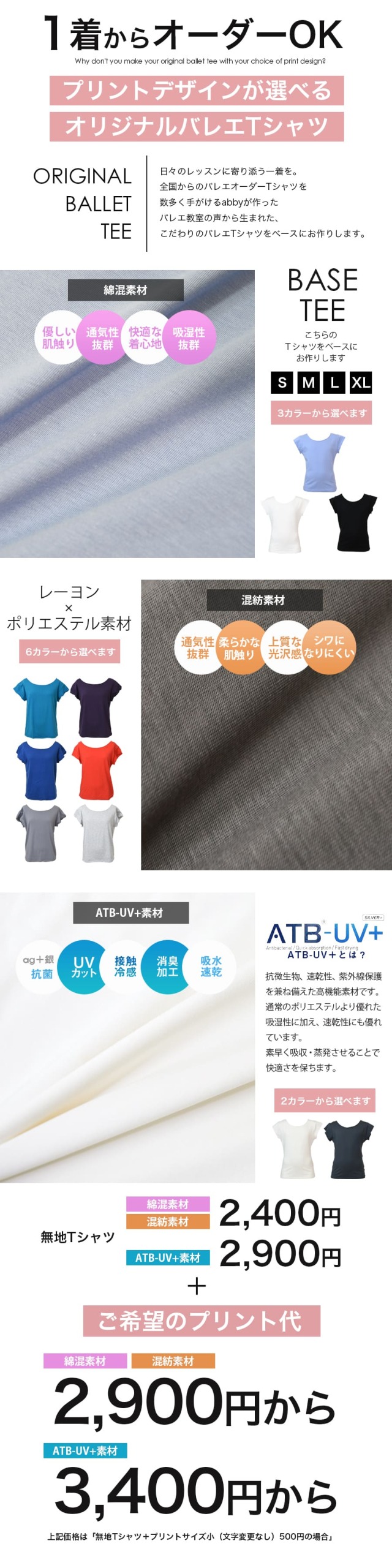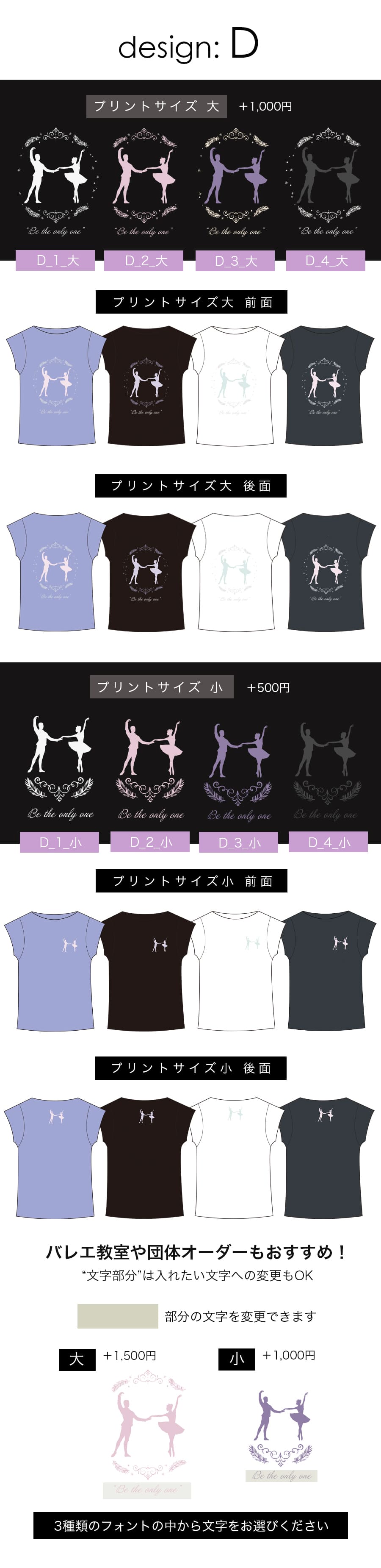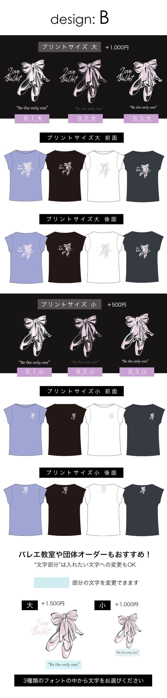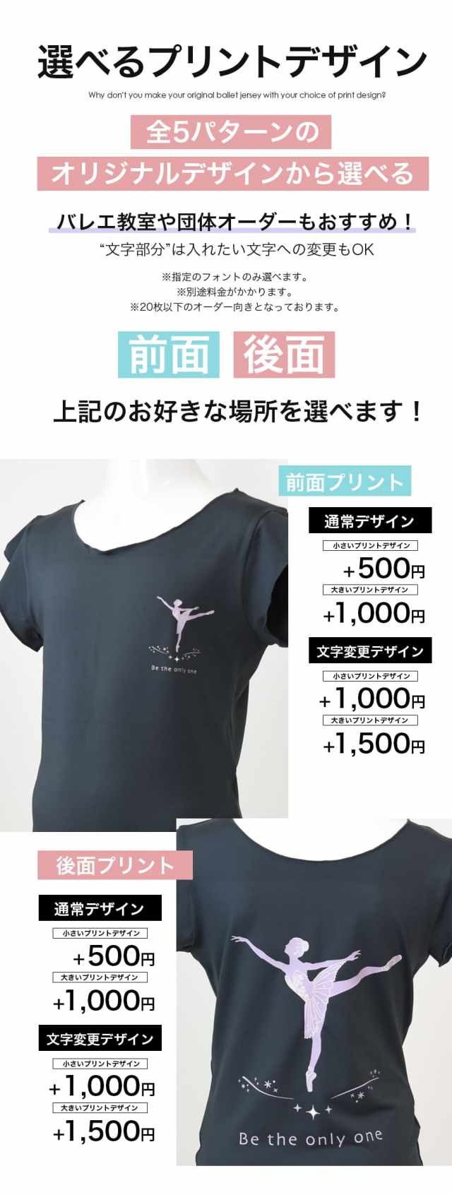 ●1着からオーダー可能:少数ロットでの注文にも対応しているので、バレエ教室や団体でのオリジナルTシャツ制作にもぴったりです。