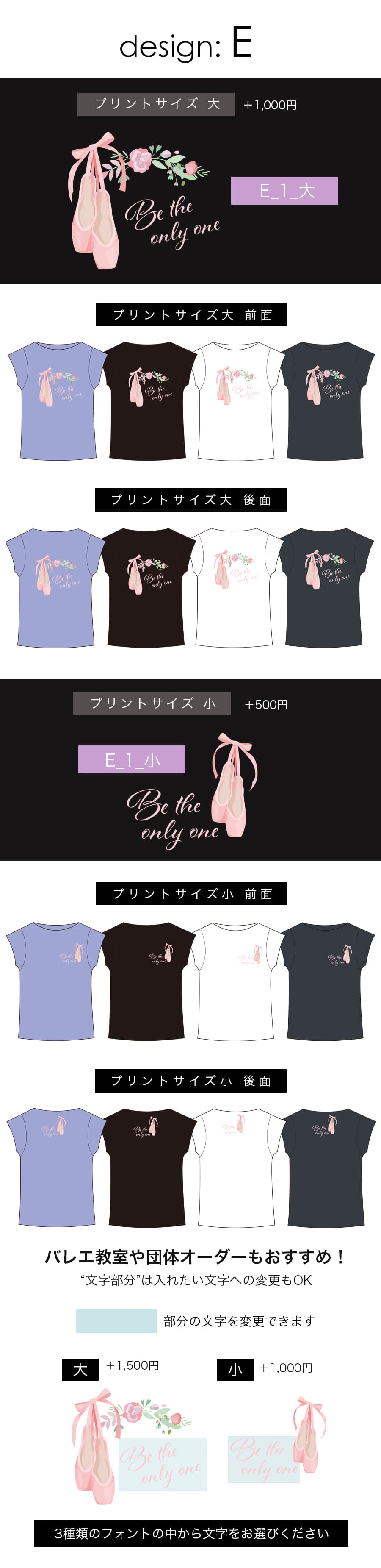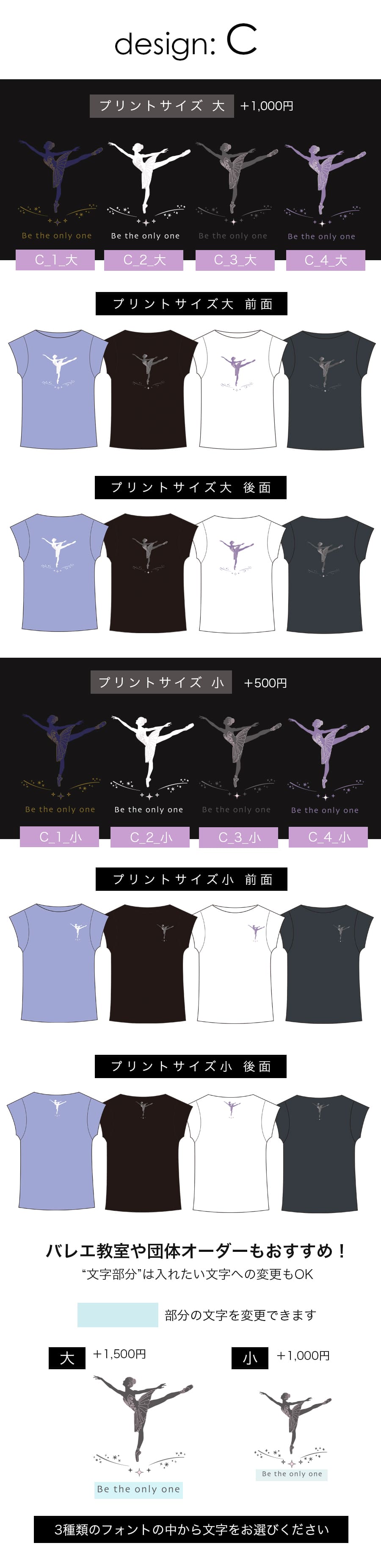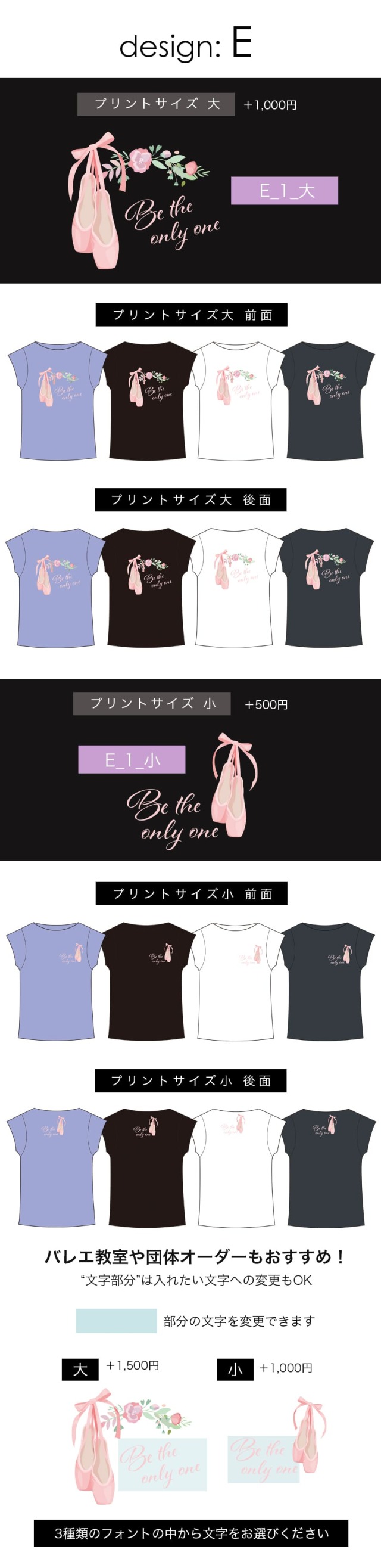 ●1着からオーダー可能:少数ロットでの注文にも対応しているので、バレエ教室や団体でのオリジナルTシャツ制作にもぴったりです。