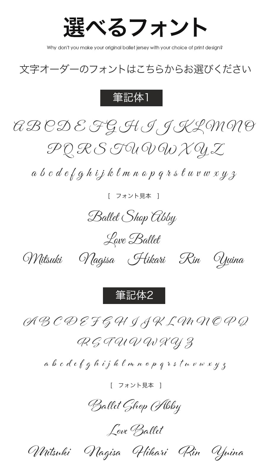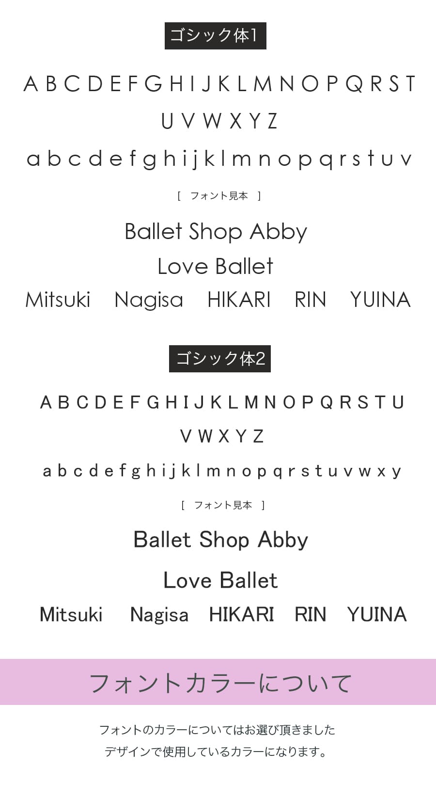 ●「文字オーダー」をご希望の場合は、ご希望のフォントをお選びいただき、入れたい文字をご記入ください。それぞれのフォントで大文字・小文字の対応可能です。