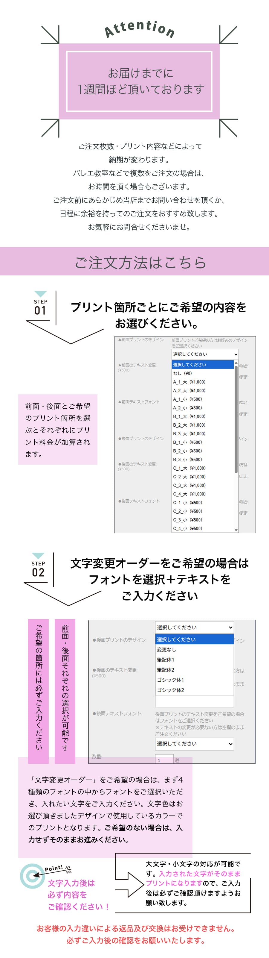 ●プリントオーダーの文字内容につきましては、ご希望の箇所それぞれにフォント選択と文字の入力が必要となります。「前面」「後面」それぞれ、必ず入力をお願いいたします。