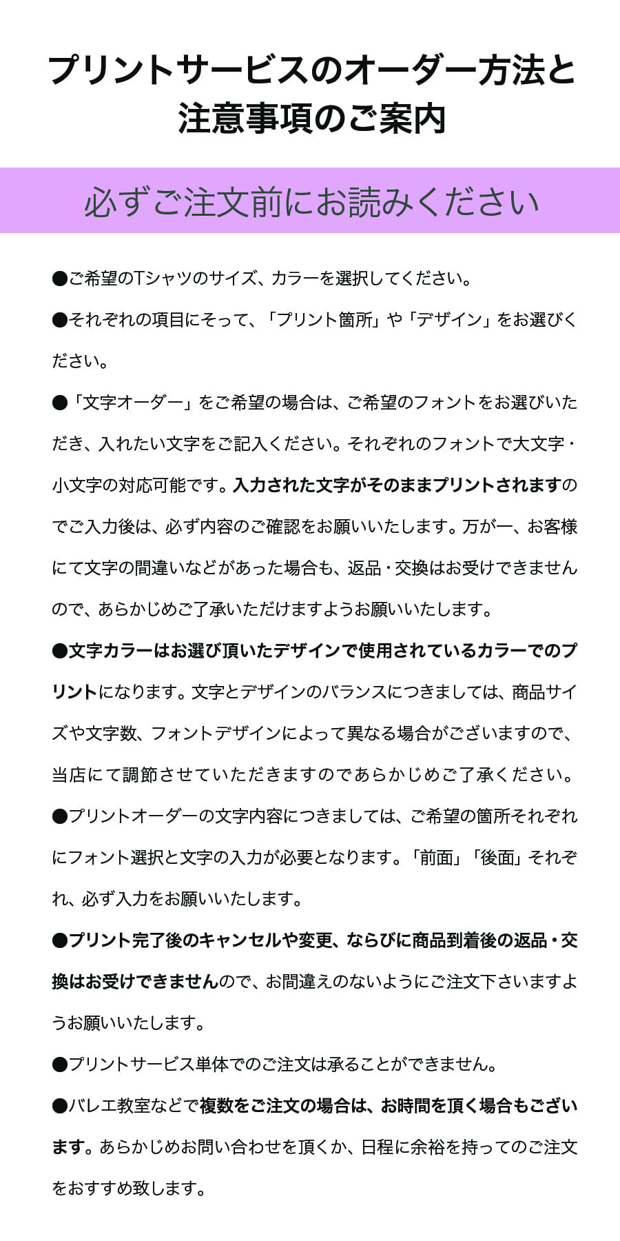 ●プリント完了後のキャンセルや変更、ならびに商品到着後の返品・交換はお受けできませんので、お間違えのないようにご注文下さいますようお願いいたします。