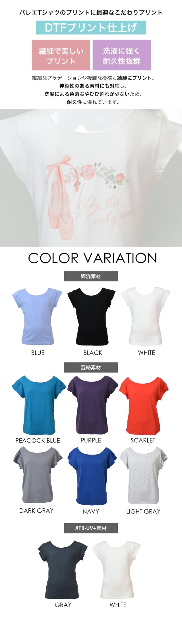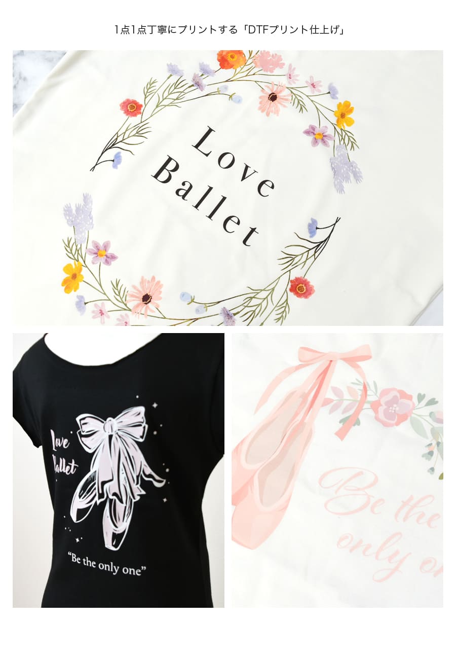 ●バレエTシャツのプリントに最適なこだわりプリント:1点1点丁寧にプリントする「DTFプリント仕上げ」。繊細なグラデーションや複雑な模様も綺麗にプリント。伸縮性のある素材にも対応し、洗濯による色落ちやひび割れが少ないため、耐久性に優れています。