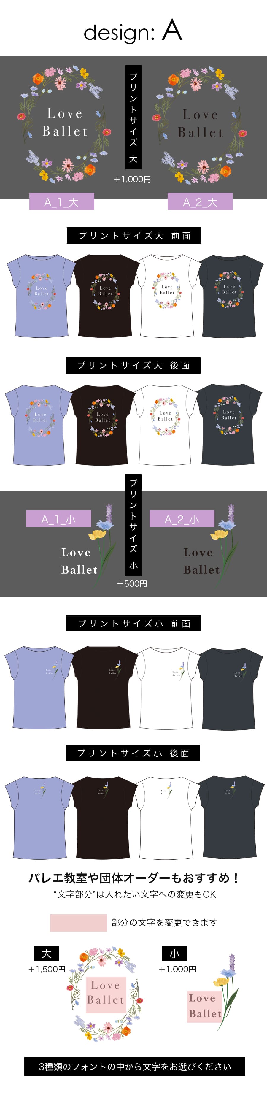 小ロットでのご注文可能ですので、バレエ教室や団体でのオリジナルTシャツ作りにもおすすめです。