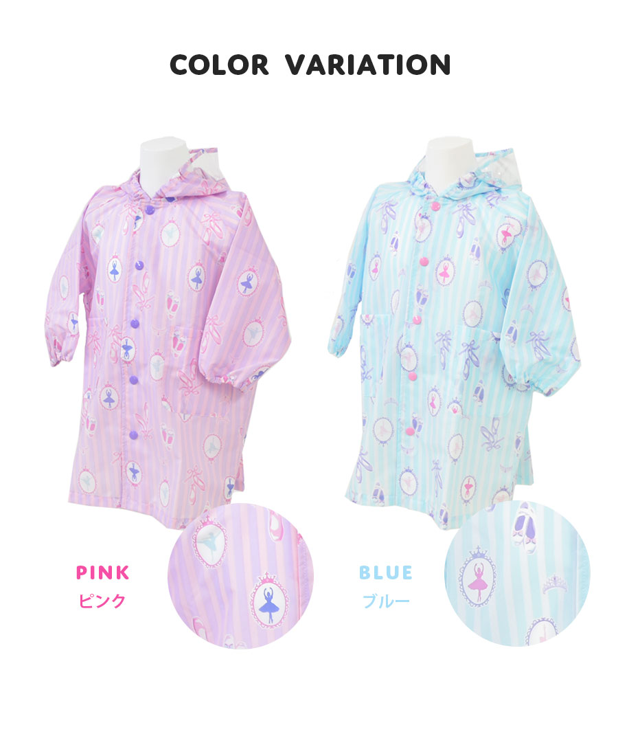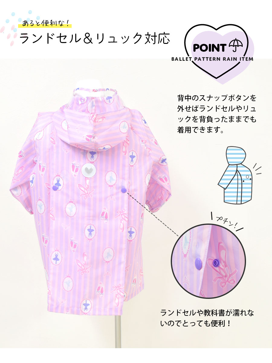 可愛いバレエ柄のレイングッズで心も体もキュートに元気に!ランドセルやリュックを背負ったまま羽織れるとっても便利なレインウェア。