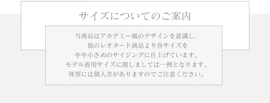 当商品はアカデミー風のデザインを意識し、他のレオタード商品より各サイズをやや小さめのサイジングに仕上げています。