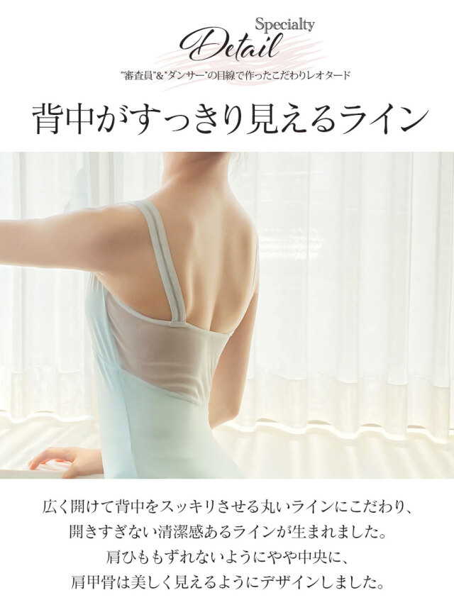 そしてストラップの位置。肩幅が狭く見えないように、しかしずり落ちて気にすることがない程度の位置、そして背中が開きすぎないこと。はっきりと肩甲骨が指導者からチェック出来るようなカットを考えました。