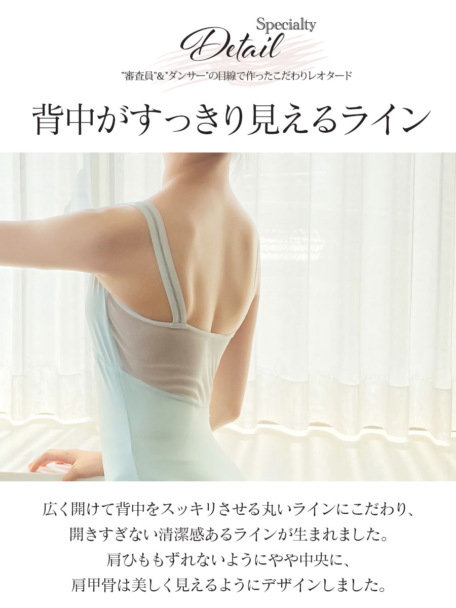 チュール&レースは肩紐、背中部分に使い、あくまでさりげなく、SINARの目指したオーディションやレッスン審査でもお使いいただけるデザイン。