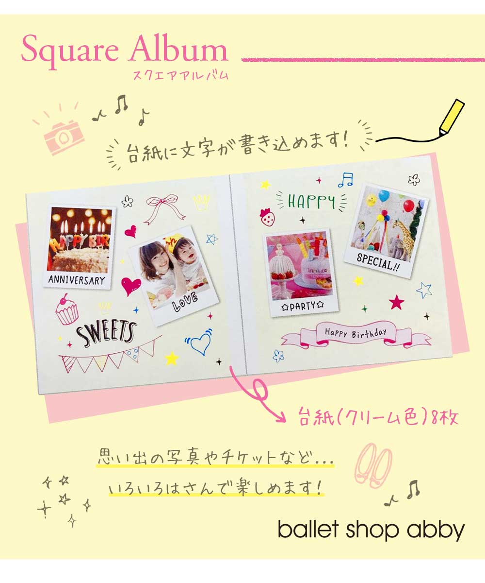 こちらは台紙に直接文字が書き込めるコンパクトサイズのアルバムです。 思い出の写真やチケットなどいろいろはさんで楽しめます! 台紙が8枚あるのでたっぷりデコレーションして写真を飾れるアルバムです。