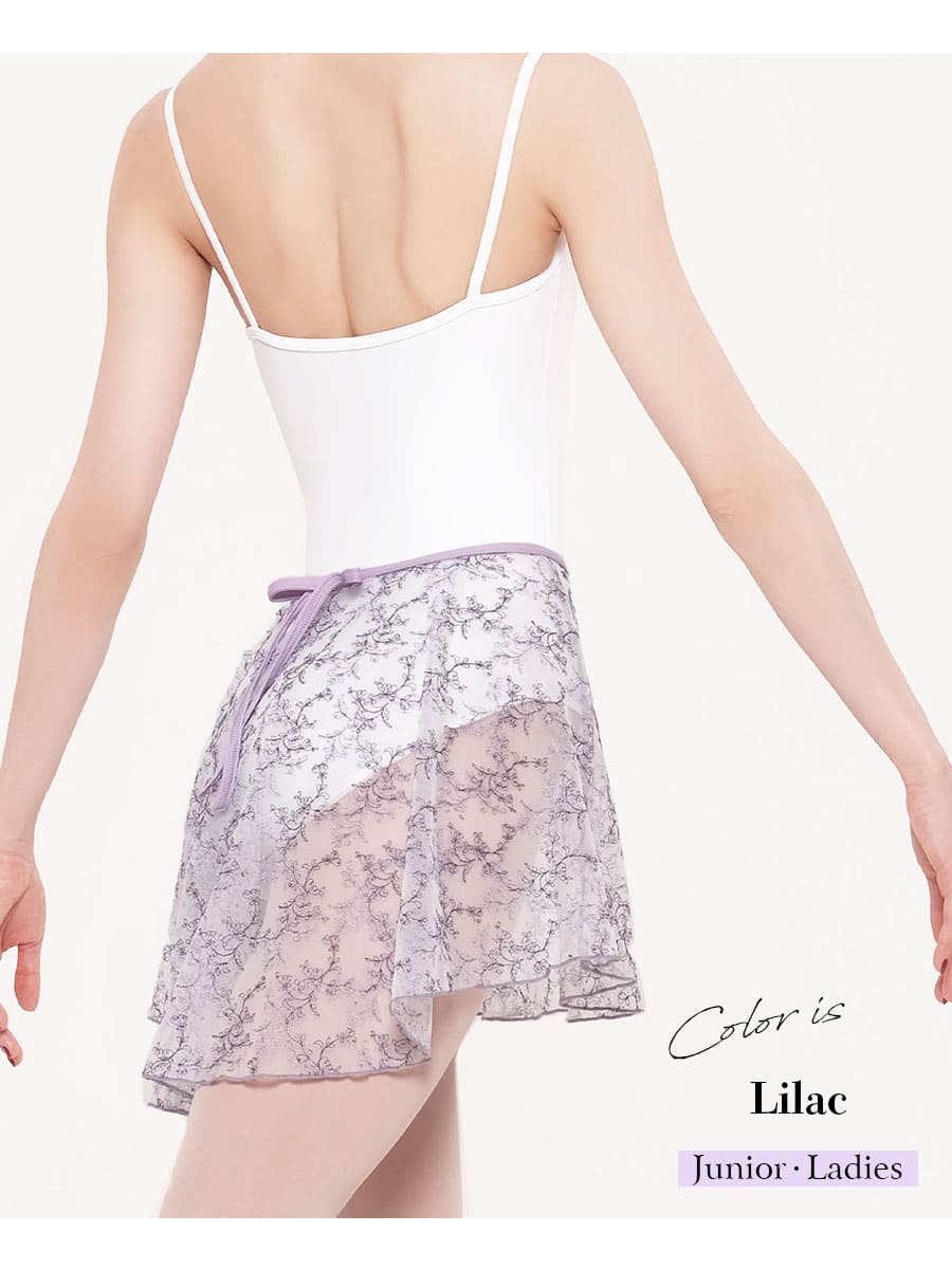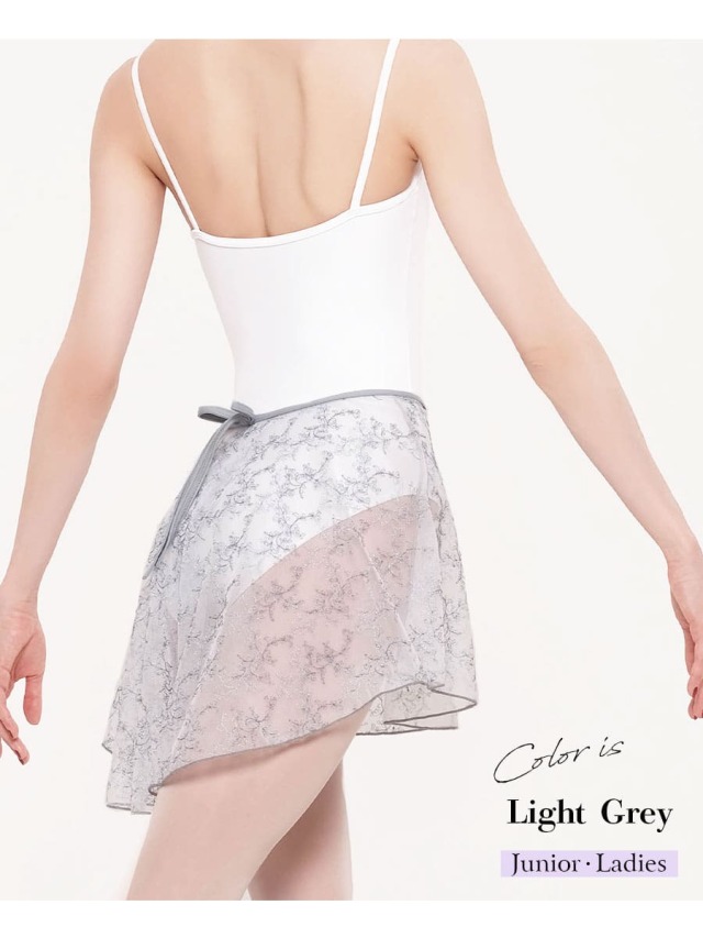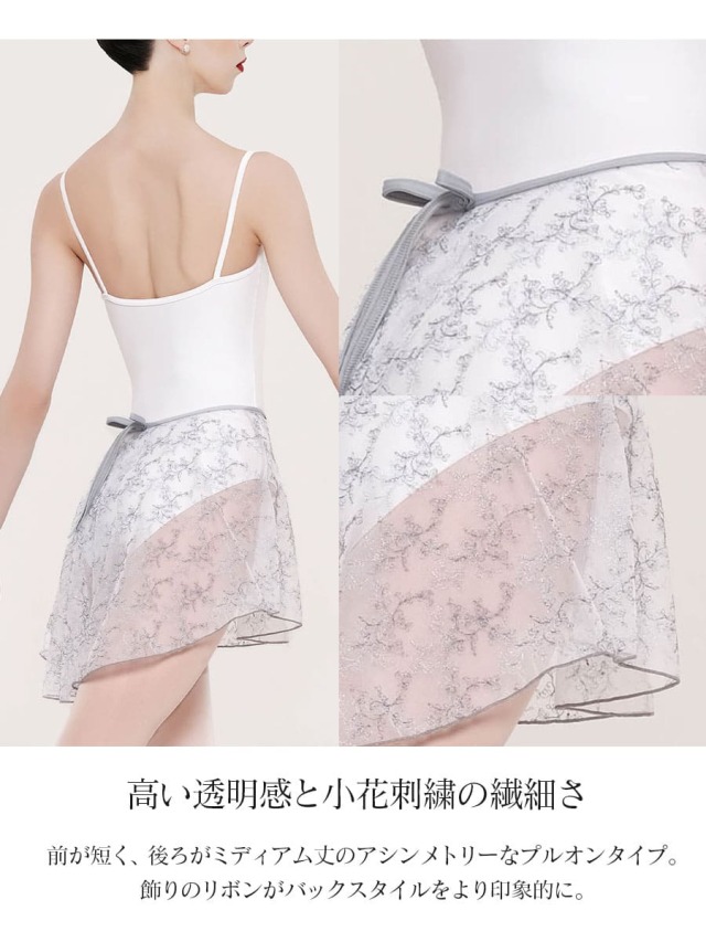 メッシュチュールが軽やかでエアリーな刺繍入りのバレエスカート。透明感が高く刺繍糸と同色のパイピングテープで印象的に。