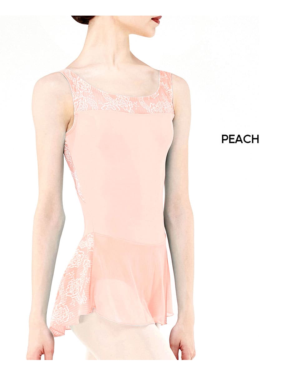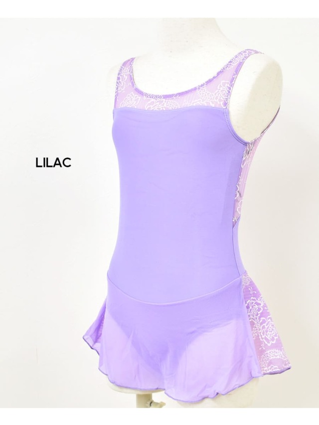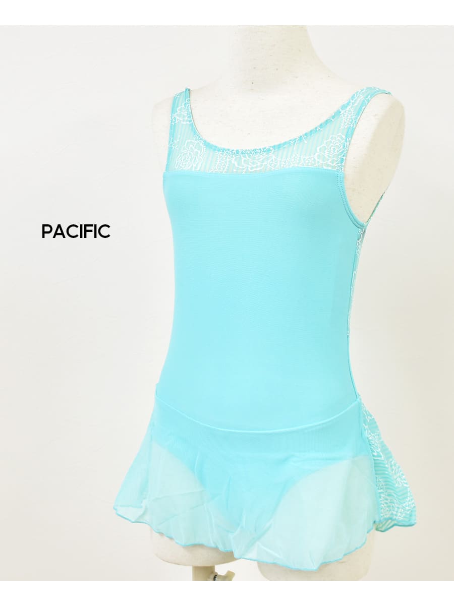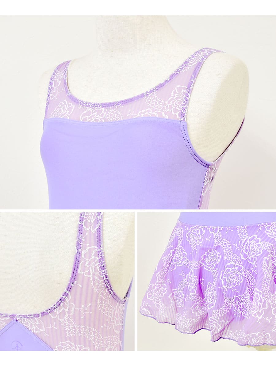 花柄モチーフがプリントされたメッシュスカート付きのジュニア用レオタード。