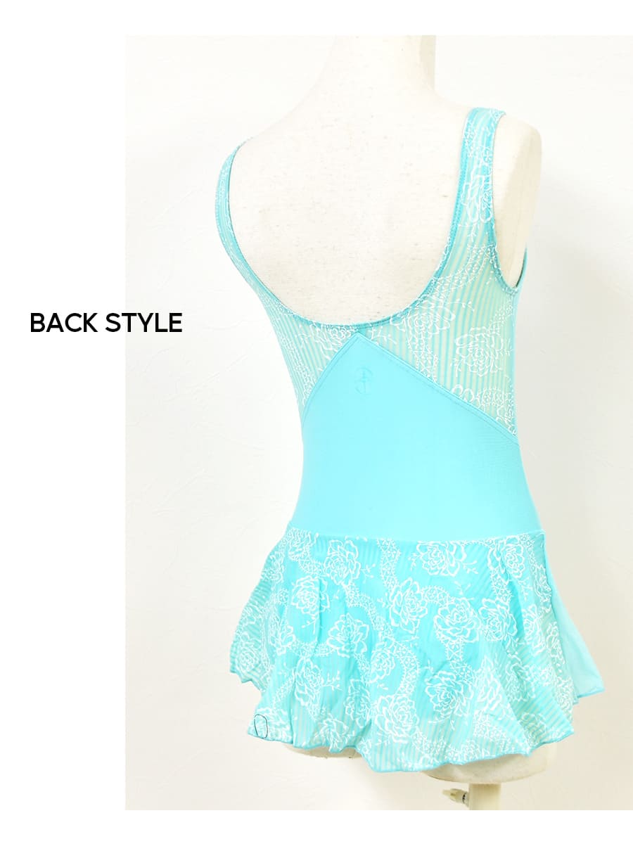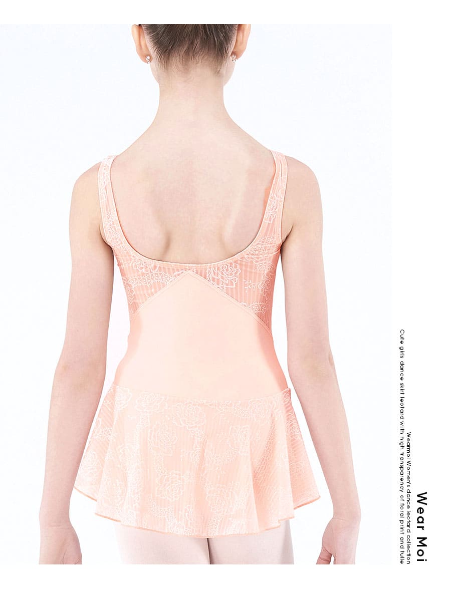 透明感のあるストレッチチュールと花柄プリントがフレッシュなカラーでさらに可愛らしく。動くたびに揺れるメッシュスカートがバレエを始めたばかりのキッズも喜びそう。背中部分のおしゃれなカッティングで後ろ姿も個性が光ります。