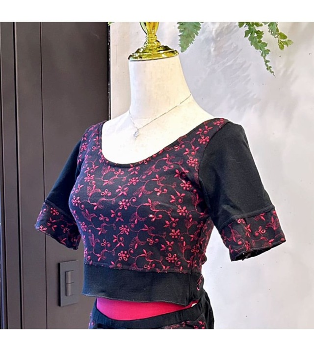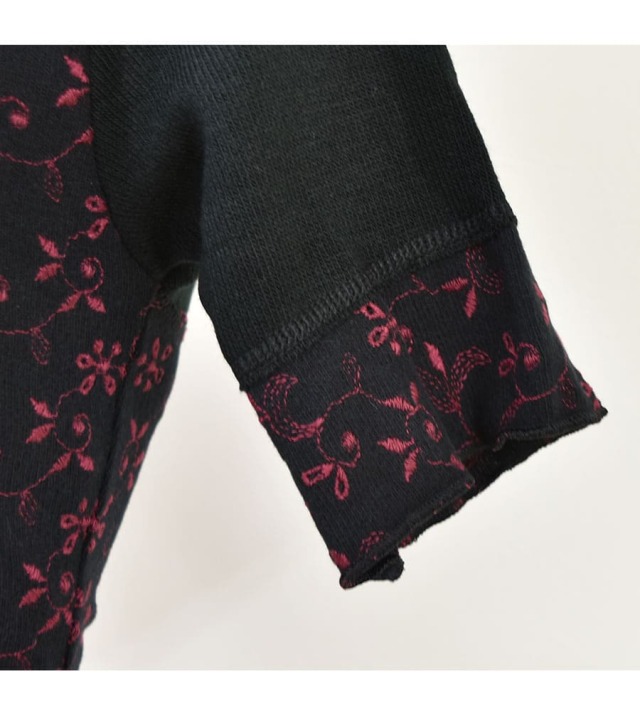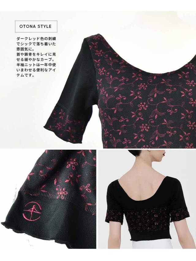 落ち着いたトーンのえんじ色の刺繍がポイントの着丈が短めのニットトップス。