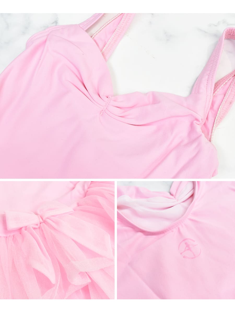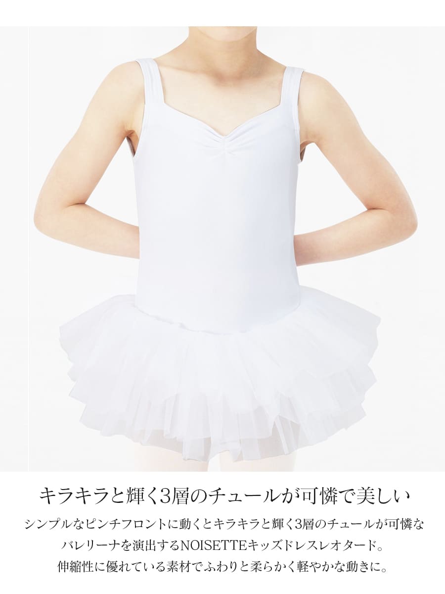シンプルなピンチフロントに動くとキラキラと輝く3層のチュールが可憐なバレリーナを演出するNOISETTEキッズドレスレオタード。