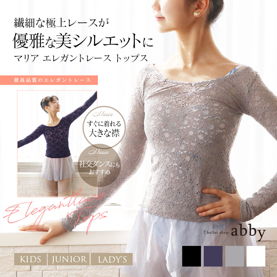 国産の上質なチュールレースを使った、透き通るような洗練されたデザインが美しいabbyオリジナル長袖レオタードです。まるでそれぞれが異なる物語の主人公のような愛らしいデザインが魅力。